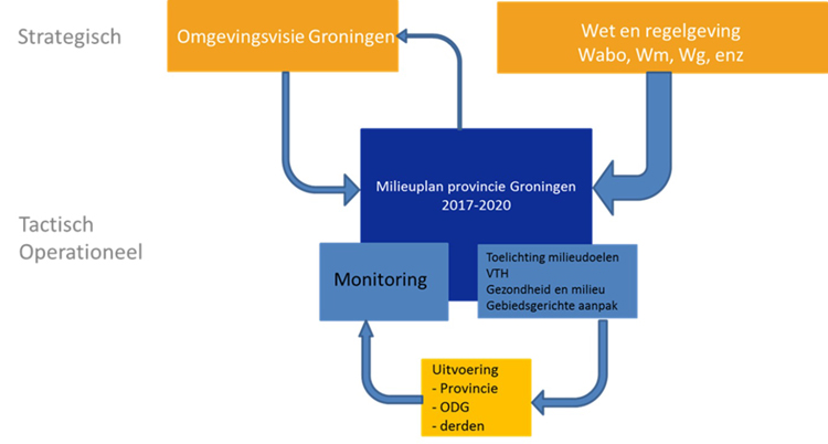 In het Milieuplan staat hoe wij de komende periode uitvoering geven aan het milieubeleid zoals dat is opgenomen in de Omgevingsvisie en in landelijke beleidskaders. De uitvoering is vastgelegd in programma's en ligt voor een groot deel bij de Omgevingsdienst Groningen (de ODG) als het gaat om taken op het gebied van vergunningverlening, toezicht en handhaving. In de monitor houden we de kwaliteit van uitvoering en de toestand van het milieu bij. Daaraan gekoppeld is een jaarlijkse evaluatie die ertoe kan leiden dat het Milieuplan wordt bijgesteld en mogelijk dat ook beleidskeuzes in de Omgevingsvisie worden bijgesteld. De thema's duurzaamheid, water en energie hebben zelfstandige programma's en komen niet terug in dit Milieuplan. |
