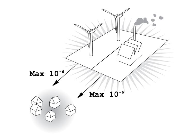 Het externe veiligheidsrisico wordt afgelezen in tabellen of rekenkundig bepaald. De risicoberekening is niet expliciet voor de berekening van het risico van scenario’s met gevaarlijke stoffen in bedrijven met in hun nabijheid windturbines. Wij vragen aan de gemeenten in een bestemmingsplan en/of een omgevingsvergunning aan te geven hoe het plaatsgebonden risico (PR 10-5 en PR 10-6) van windturbines en van bedrijfsactiviteiten met gevaarlijke stoffen binnen het afwerpgebied van de initiatiefnemer (bedrijf of windturbine-exploitant) bepaald is. Wij zullen hetzelfde bij onze inpassingsplannen en/of omgevingsvergunningen doen.