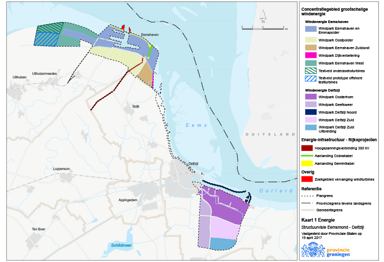 Een belangrijk deel van de plannen die in de Eemsdelta worden gerealiseerd zijn plannen voor windenergie. De provincies hebben samen met het Rijk afgesproken dat op 31-12-2020 een vermogen van 6.000 MW aan windenergie op land in Nederland operationeel is. Op 22 januari 2013 hebben provincies een afspraak met het Rijk gemaakt over de onderlinge verdeling van deze taakstelling. Wij hebben 855,5 MW voor onze rekening genomen. Ons beleid voor windenergie is in de Omgevingsvisie en de Omgevingsverordening opgenomen. Het grootste deel van deze taakstelling wordt in de Eemsdelta gerealiseerd.